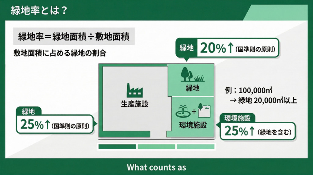 敷地面積の20%以上を緑地として確保する必要があります。これは、国が定める「工場立地に関する準則(国準則)」における原則的な基準です。ただし、地方自治体が条例により緑地率等を緩和・変更している場合もあります。